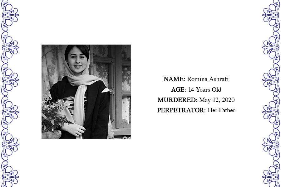 On May 12, 2020, in Sefid Sangan, Talesh, Gilan province, Iran, 14-year-old Romina Ashrafi was killed by her father, Reza Ashrafi, as she slept. This incident occurred shortly after the police had returned Romina to her parental home, following her elopement with 28-year-old Bahman Khavari. The event escalated to national and international prominence, resulting in Reza Ashrafi's conviction and a nine-year prison sentence.